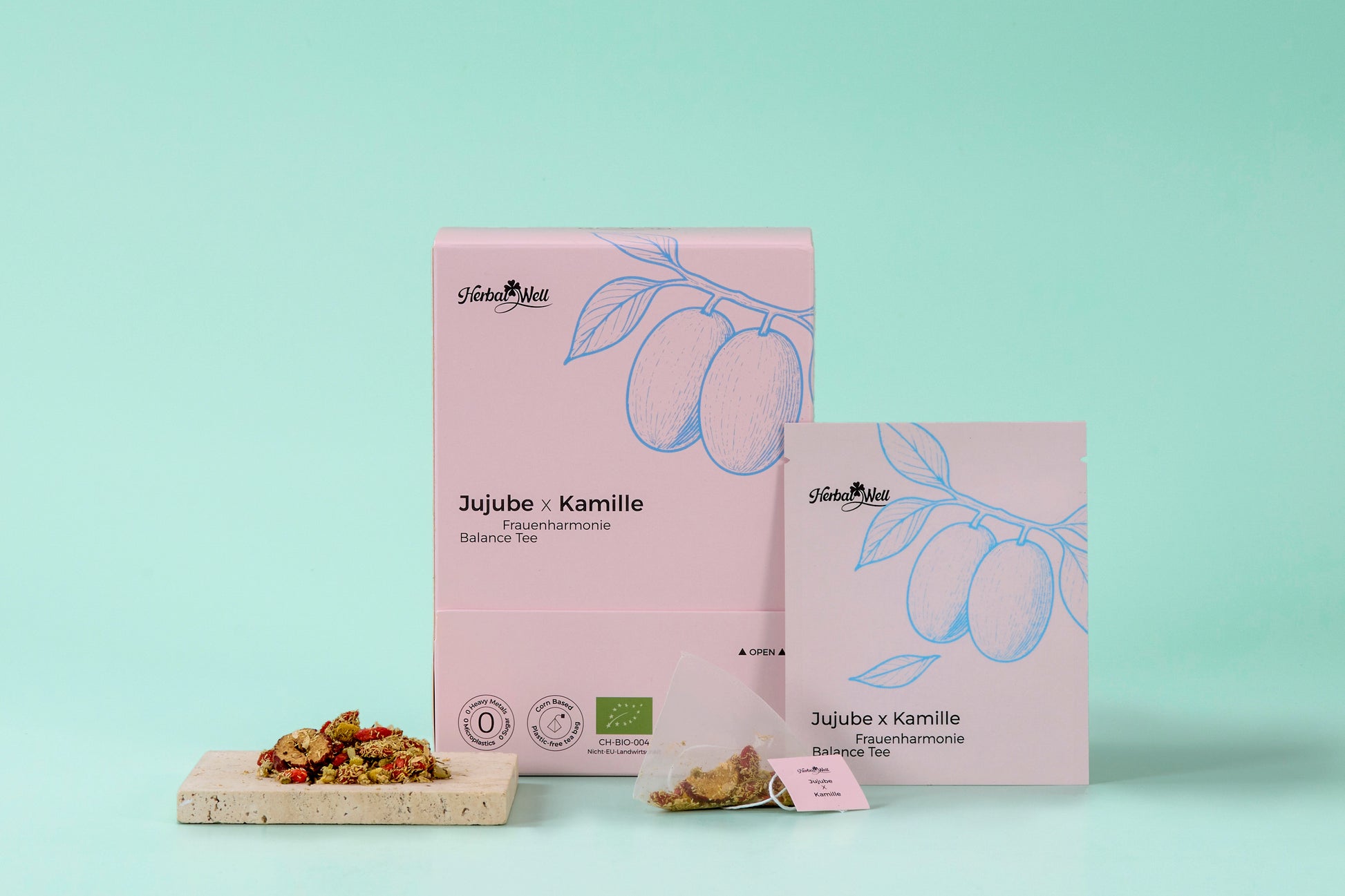Infusion de plantes médicinales biologiques, mélange de jujubes, de camomille et de baies de goji.
